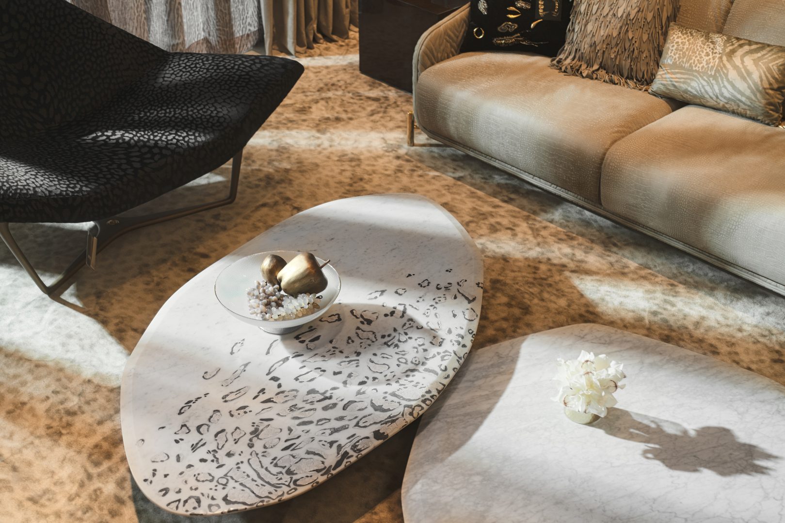 Tại đây, đội ngũ thiết kế của Roberto Cavalli sắp đặt khéo léo và tỉ mỉ đến từng chi tiết nội thất trong dinh thự The Coral Cavalli bao gồm thảm, giấy dán tường, sofa, bàn ăn, giường ngủ… nằm trong bộ sưu tập nội thất 2022 – The Wild Collection của Cavalli.